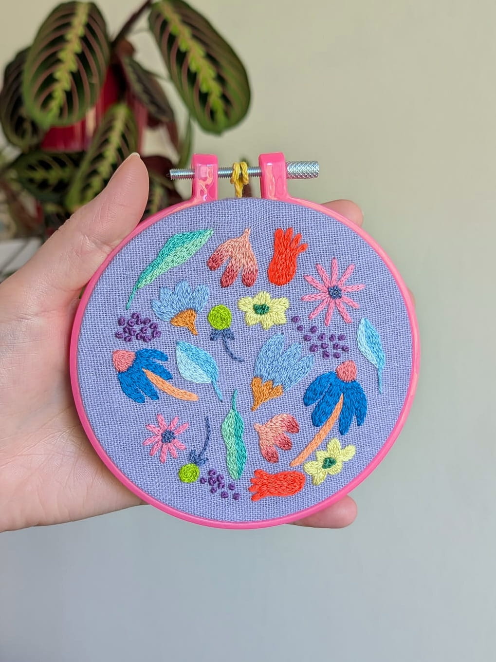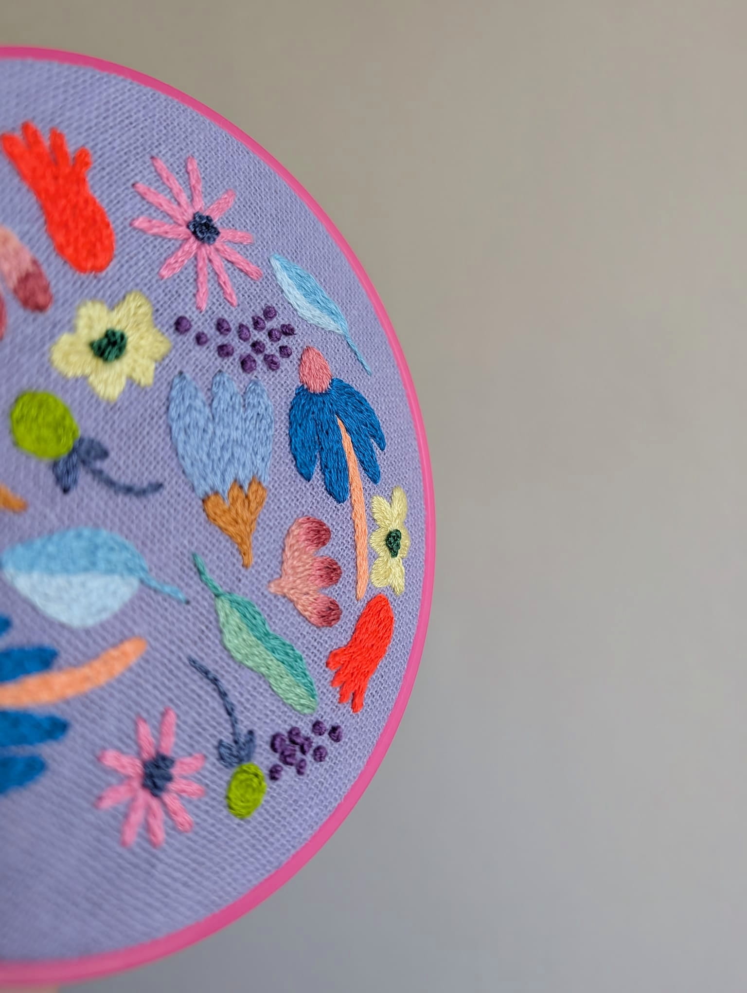 Este modelo combina un bastidor de plástico de color rosa flúor, tela de lino de color lavanda y un gran variedad de hilos.